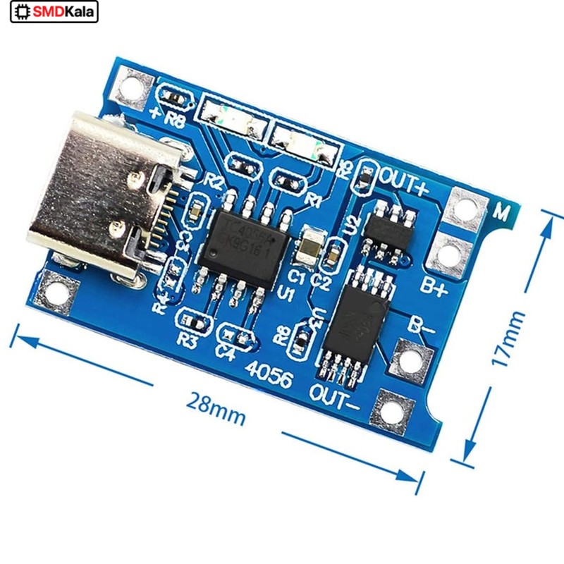 آی سی کنترل شارژ : TC4056 یا TP4056 / آی سی محافظ : DW01 / ماسفت شارژ :8205A / ولتاژ ورودی : 5 ولت (که توسط میکرو USB TYPE C یا توسط دو پدی که در دوطرف USB است باید تامین شود) / ولتاژ شارژ کامل : 4.2 ولت / جریان شارژ : در حالت عادی 1 آمپر (قابل تغییر با تغییر مقاومت R3) / ماکزیمم جریان خروجی : 3 آمپر / روش شارژ : جریان ثابت/ ولتاژ ثابت (CC/CV) / نشانگر وضعیت در حال شارژ : دارد (ال ای دی قرمز) / نشانگر وضعیت شارژ کامل : دارد ( ال ای دی سبز) / محافظت در برابر شارژ بیش از حد : دارد / محافظ در برابر دشارژ بیش از حد : دارد / محافظت در برابر اتصال کوتاه : دارد / محافظت در برابر جریان اضافی : در برابر جریان های بیش از 3 آمپر محافظت شده